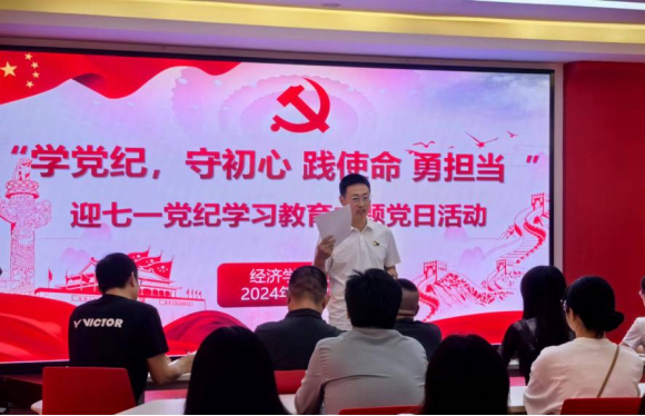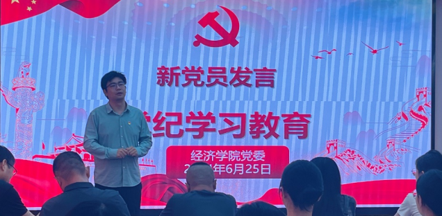 党委书记郭晋南为全体党员讲授了一堂生动的党课。郭书记以典型违纪案例警示教育开篇,警醒各位党员以身作则,坚守初心,时刻保持警惕。他强调,党员同志必须积极学习党的先进思想,才能确保我们党始终走在时代前列,始终成为全国人民的主心骨,始终成为坚强的领导核心。他结合党的历史、党的理论和党的实践,深入浅出地阐述了党的纪律和规矩的重要性,以及作为党员应该具备的责任和使命。随后,新党员代表、经济学教研室夏宇同志做了发言。他说,作为一名新党员,一定要加强党的理论学习,以优秀党员的标准要求自己,坚持不懈,不忘初心,知行合一,平凡踏实,努力践行为人民服务的宗旨!