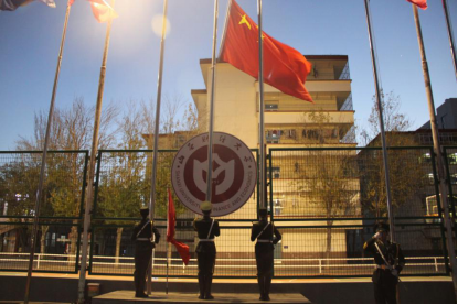 6点30分,雄壮的《义勇军进行曲》准时响起,升旗仪式正式开始。伴随整齐的步伐,校国旗班的同学们以饱满的热情,庄严地护卫着五星红旗走向升旗台。升旗手振臂一挥,鲜艳的五星红旗铺展开来,全场庄严肃穆,全体师生行注目礼,鲜艳的五星红旗在国歌声中随朝阳一同冉冉升起。在朝阳的渲染下,五星红旗的色彩格外耀眼。